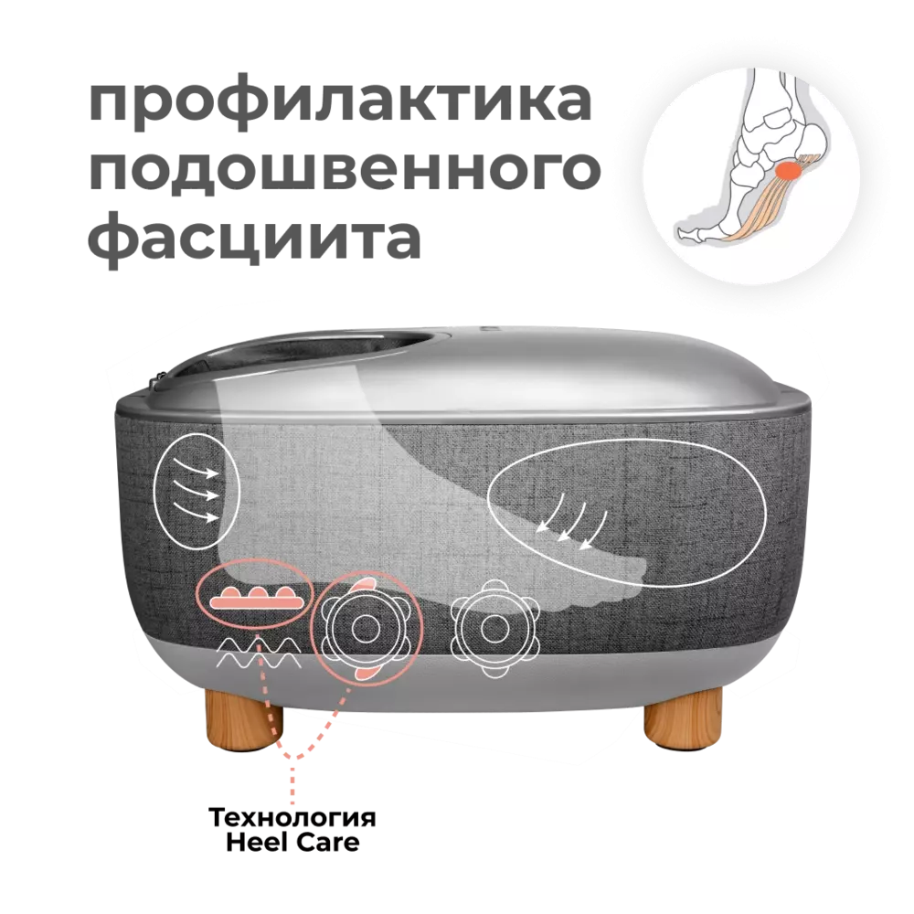 Функция Heel Care осуществляет комплексное воздействие на ахиллово сухожилие и подошвенные фасции, улучшая эластичность связок и работоспособность мышц стопы, снимая боль и судороги в области пяток, ускоряя движение лимфы и кровотока, тем самым улучшая снабжение тканей питательными веществами и кислородом.