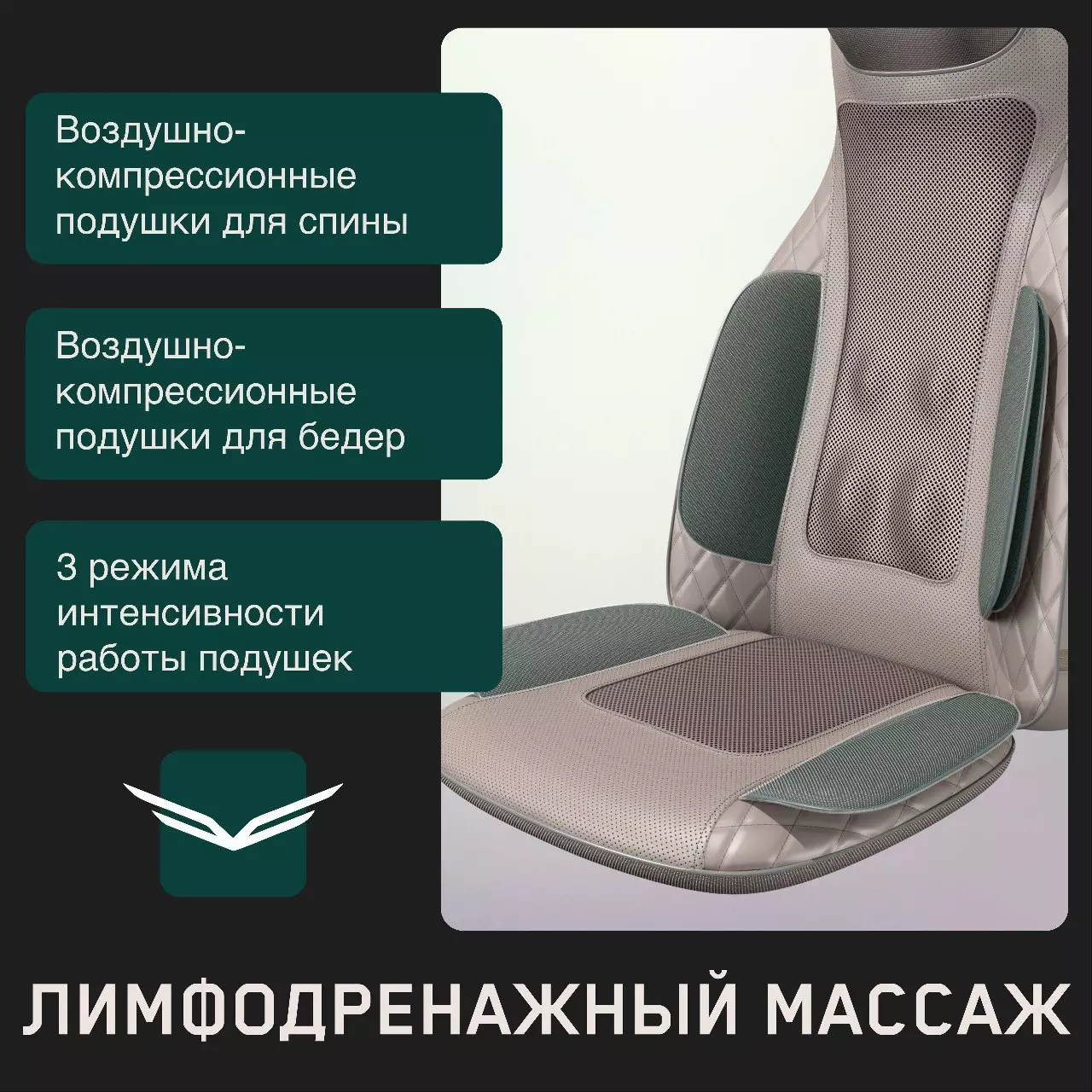 Для качественного лимфодренажного массажа в накидке установлено 9 воздушно-компрессионных подушек. Многокамерные подушки расположены по бокам спинки и сиденья. Предусмотрено 3 уровня интенсивности лимфодренажного массажа. В сиденье дополнительно предусмотрен вибромассаж. В сочетании с воздушно-компрессионным он отлично снимает напряжение, что важно для тех, кто много сидит.