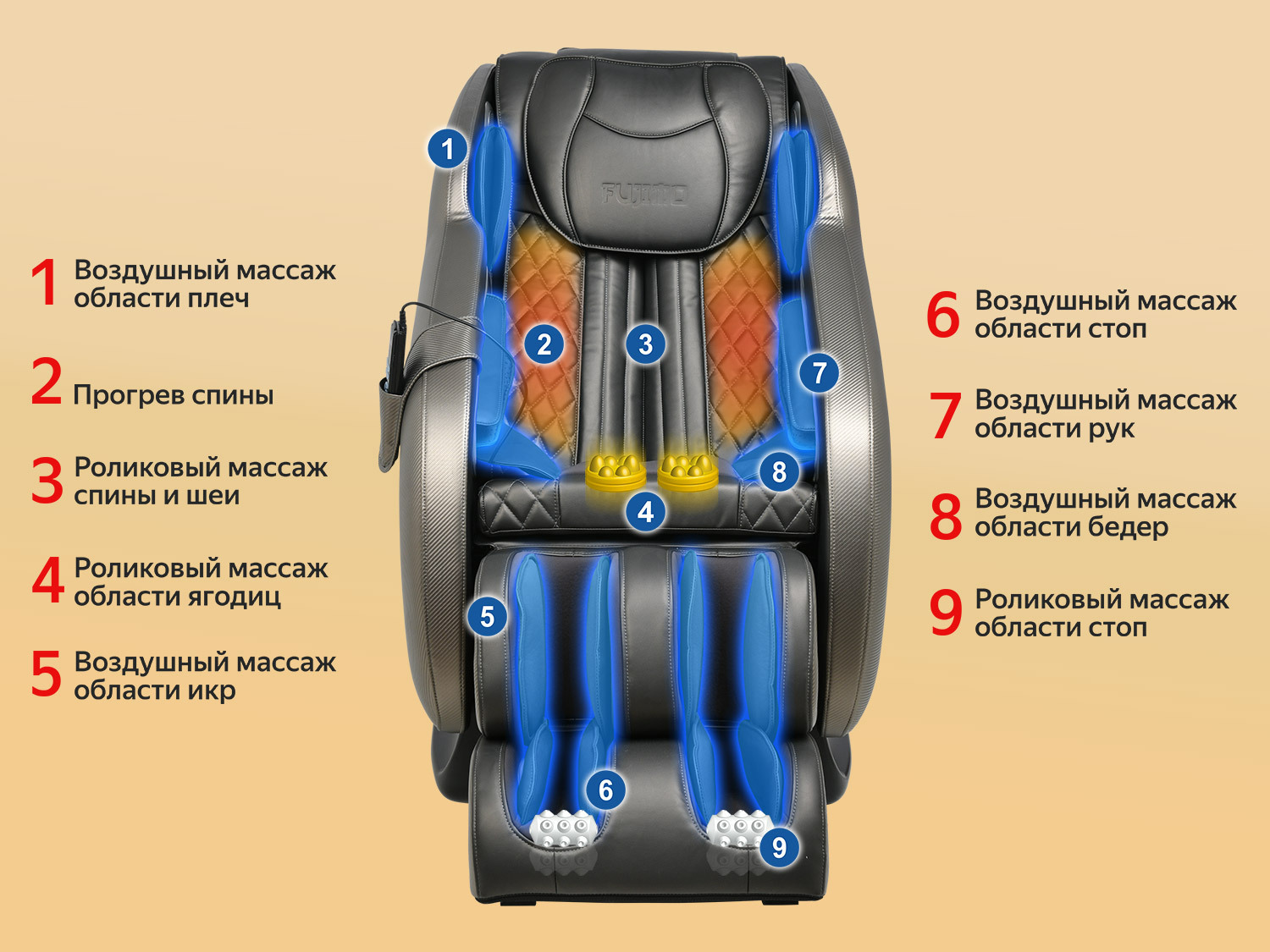 | Зоны массажа | Шея / Спина / Поясница / Плечи / Руки / Бедра / Ягодицы / Икры / Стопы |