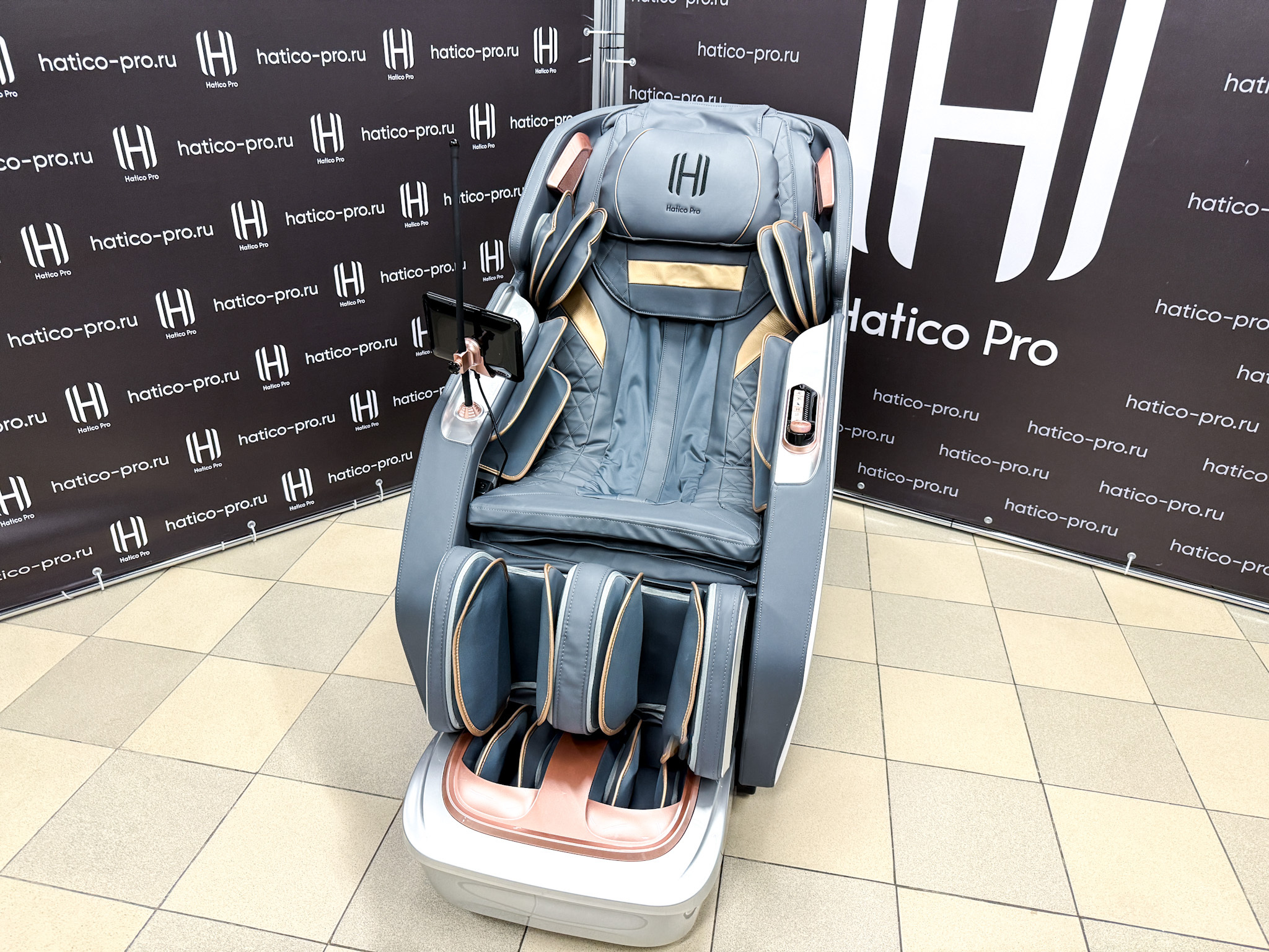 На левом подлокотнике кресла размещён дополнительный пульт управления, предназначенный для оперативного доступа к функциям кресла и техникам массажа.