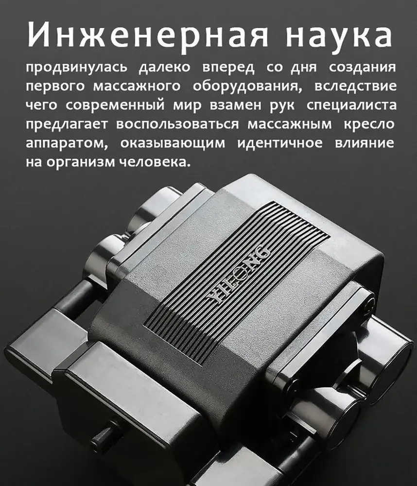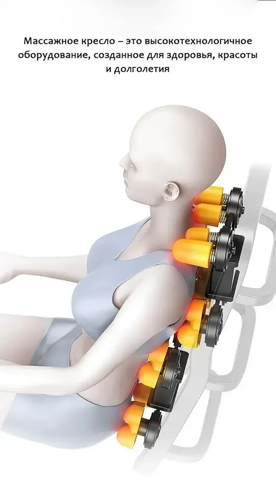 Чтобы массаж спины был наиболее полным и эффективным, в спинке кресла установлено 22 ролика, собранные в 8 групп от шеи до поясницы. Ролики подстраиваются под людей разного роста и комплекции. Кресло сделано так, чтобы анатомически повторять все изгибы тела. В области плеч установлены ролики удлиненной формы для глубокого разминания.