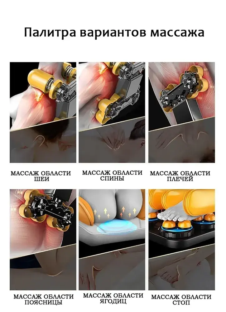 Это массажное кресло имеет следующие характеристики: восемь нажимных движений, английский пульт дистанционного управления с большим экраном, U-образная подушка, подушка безопасности для всего тела, обогрев талии и обогрев ног, ролики для ног, разминание подушки, музыка Bluetooth, подушка безопасности.