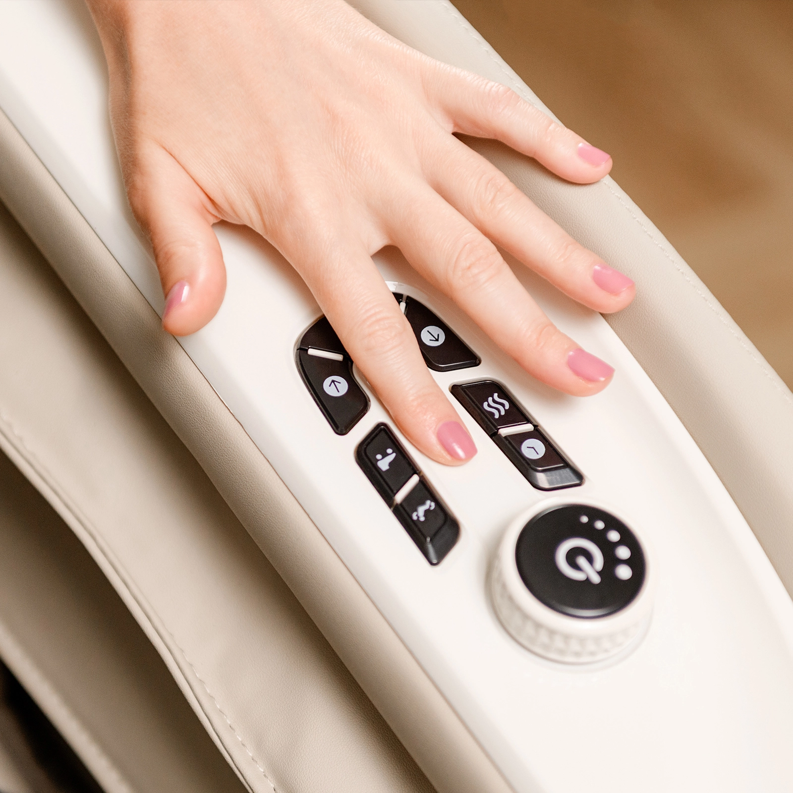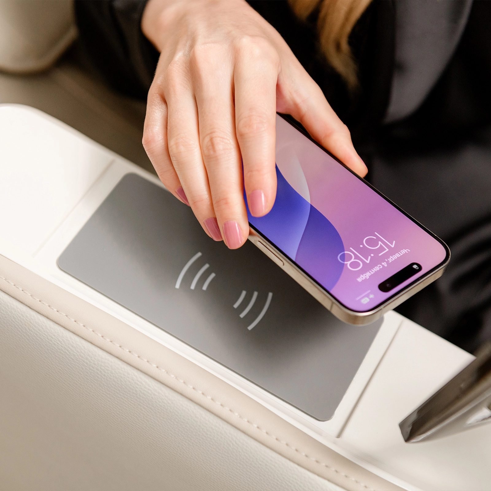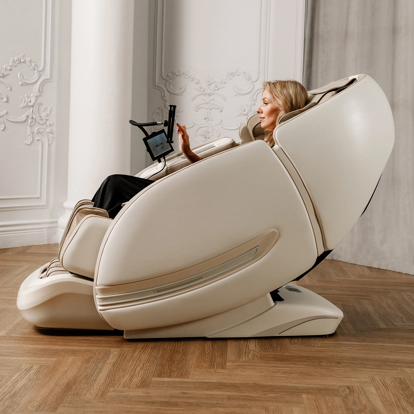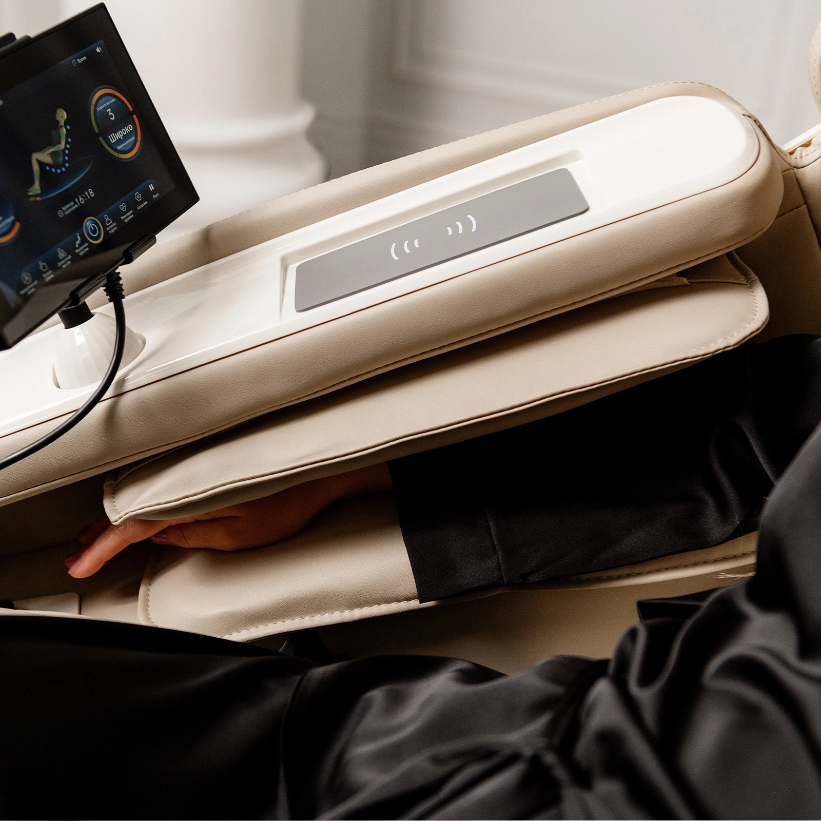 Для комфортного использования смартфона во время сеанса предусмотрена специальная кнопка пролистывания ленты социальных сетей в области пальцев. В подлокотник встроена беспроводная зарядка для смартфона и подвижная подставка для гаджетов.