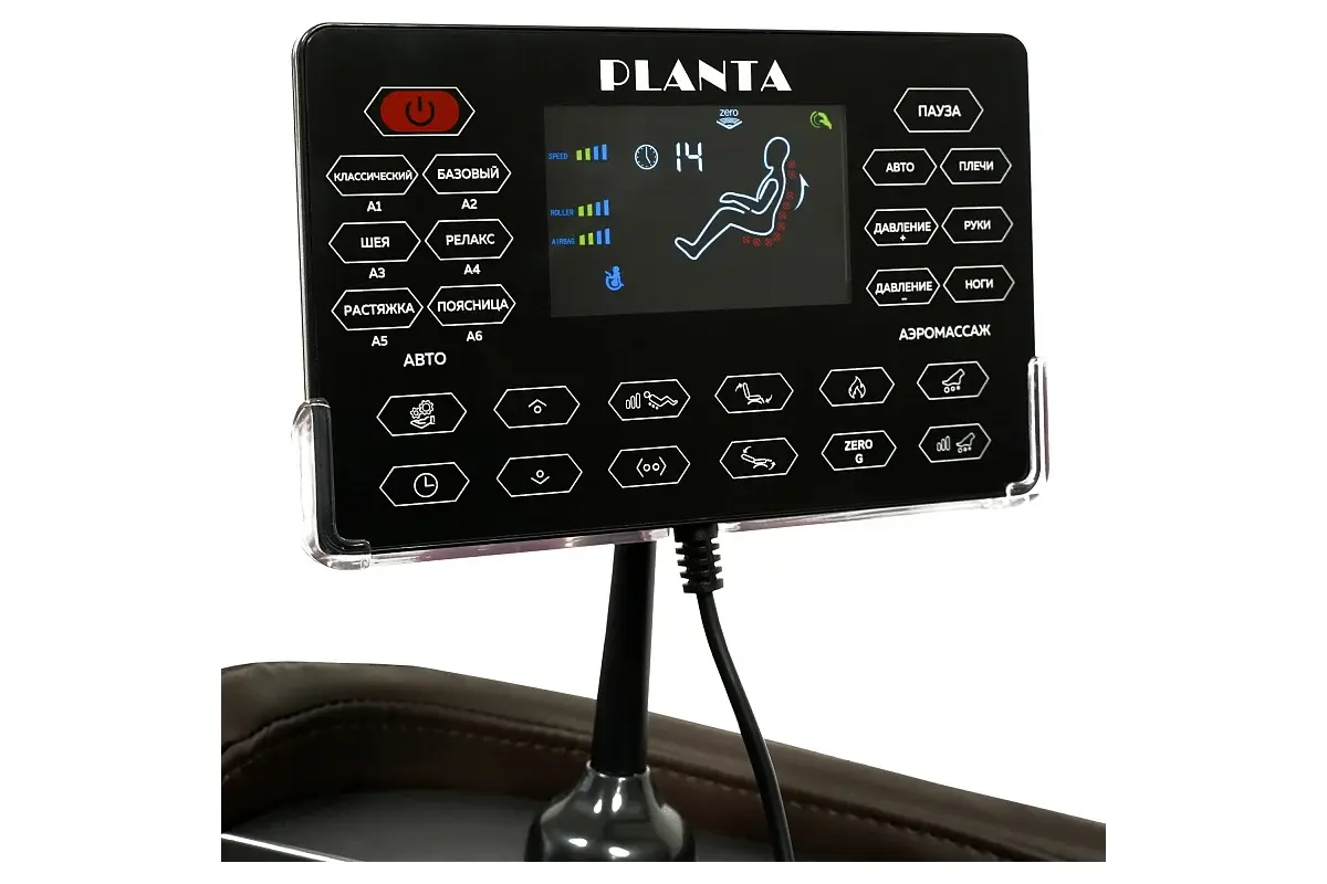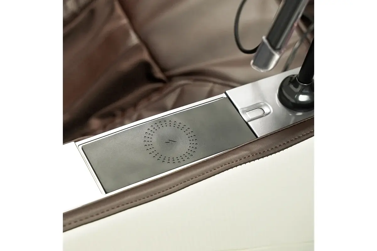 Массажное кресло электрическое имеет 6 автоматических программ, сочетающих в себе различные виды и техники массажа, 4 программы аэромассажа, а также 6 видов ручного массажа с независимым управлением механизмами прибора, что позволяет регулировать положение массажных роликов по высоте и фиксировать их в определенном положении. Кресло массажное электрическое имеет таймер на 5, 10, 15, 20, 25 и 30 минут, 3 уровня интенсивности аэромассажа, 3 уровня скорости движения роликов, подогрев спины и поясницы. Настройки массажа доступны на панели управления с LED-дисплеем и на панели быстрого доступа, есть встроенные динамиками с функцией Bluetooth и площадка для беспроводной зарядки, расположенная на одном из подлокотников.