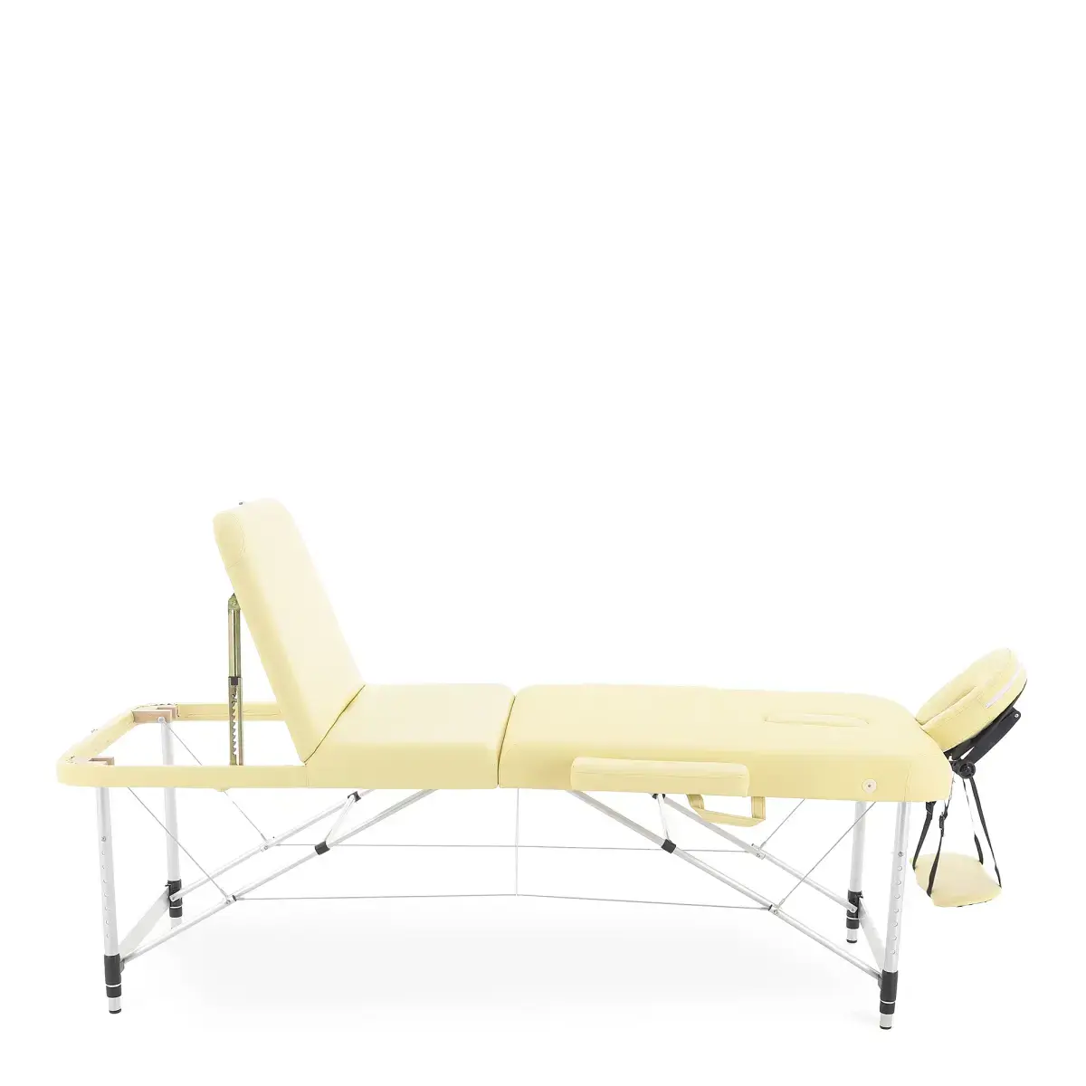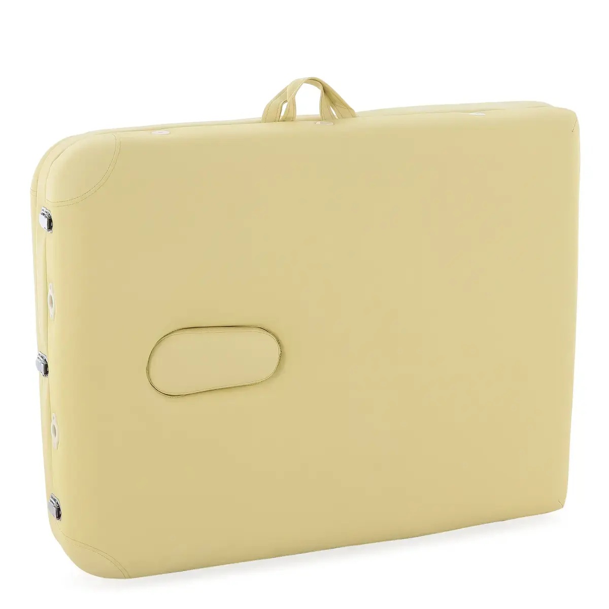 Стол, обладающий элегантным и лаконичным дизайном, выполненный в бежевом цвете, складывается в чемодан для удобной транспортировки. Оборудован поднимающимся подголовником, снабженным лицевым вырезом, продублированным в изголовье, и подвесом для рук.
