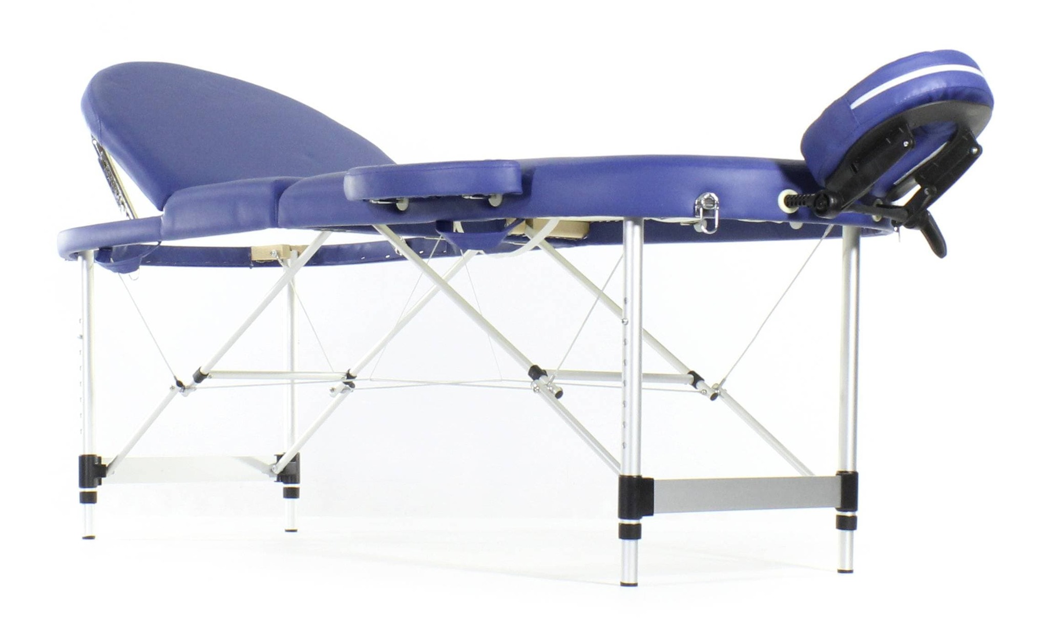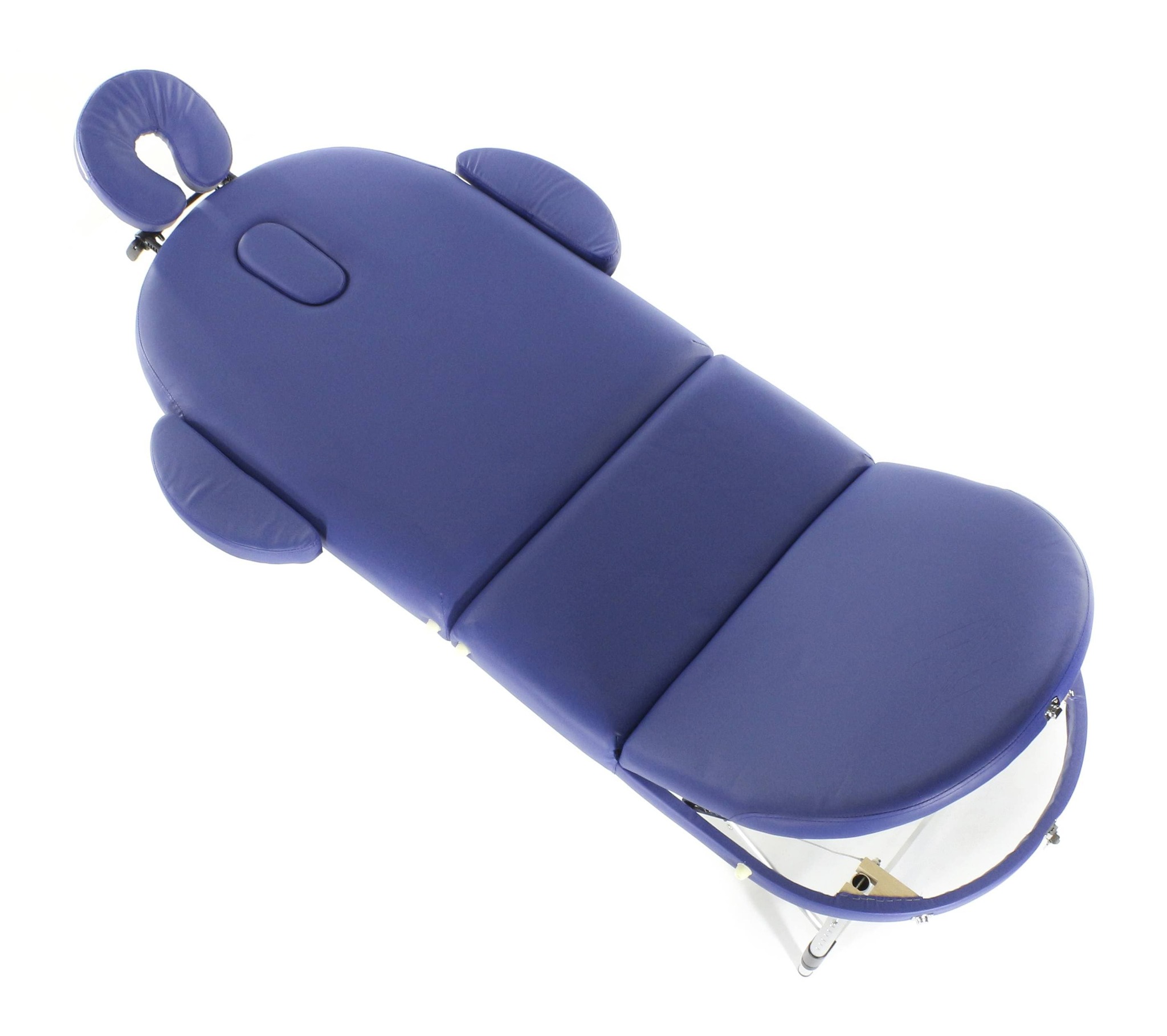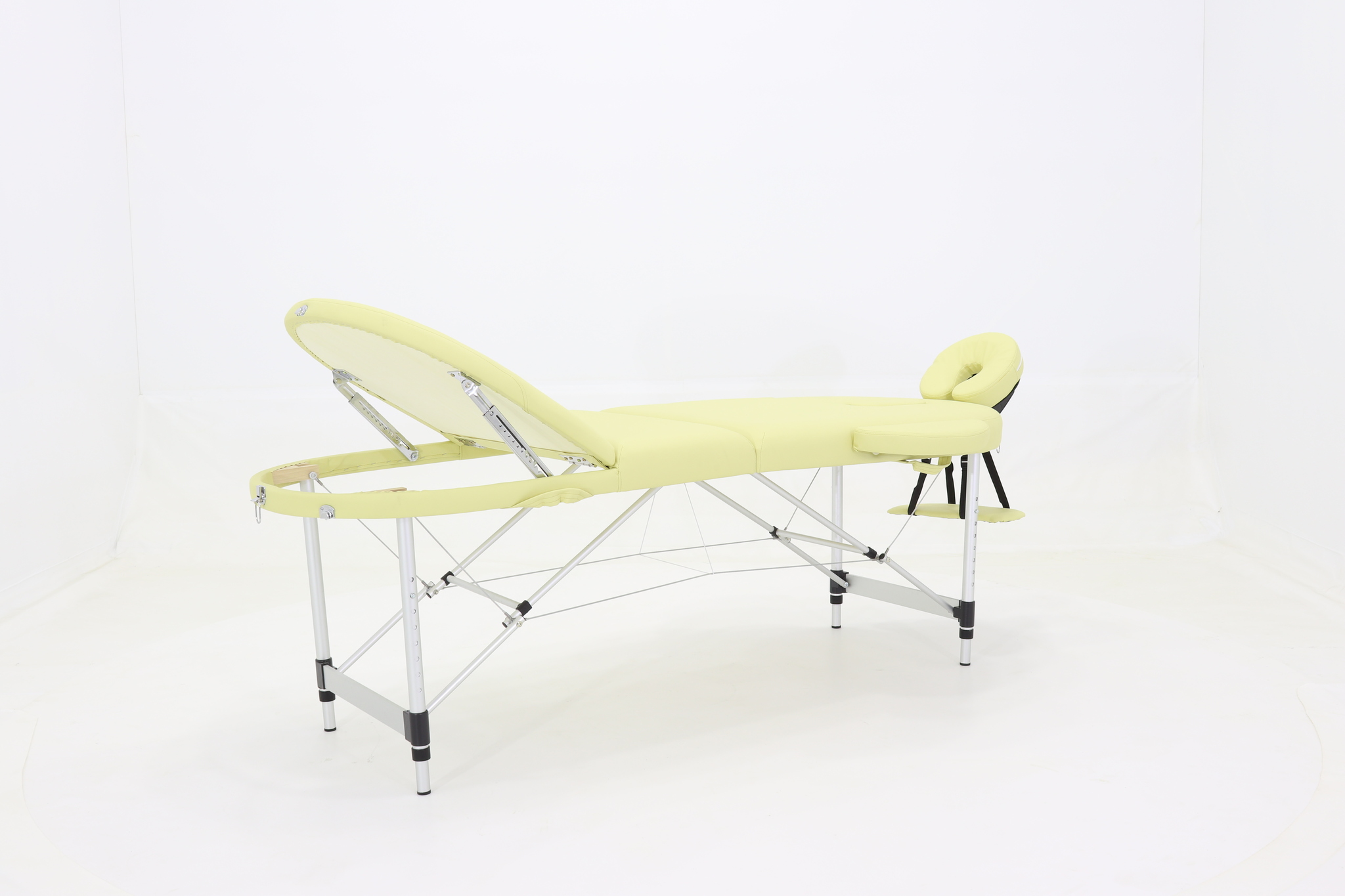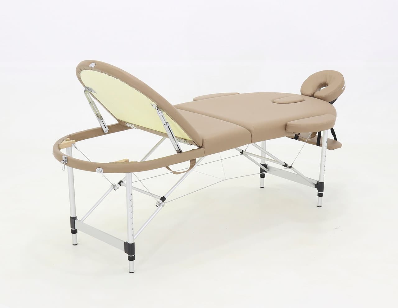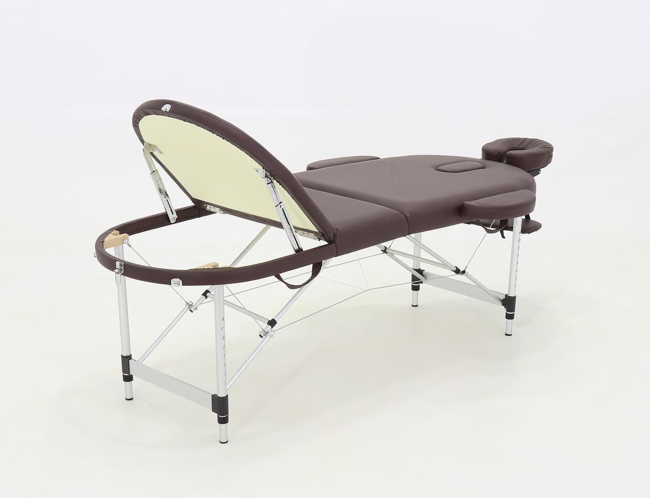 Стол, обладающий элегантным и лаконичным дизайном, складывается в чемодан для удобной транспортировки. Оборудован поднимающимся подголовником, снабженным лицевым вырезом, продублированным в изголовье, и подвесом для рук.