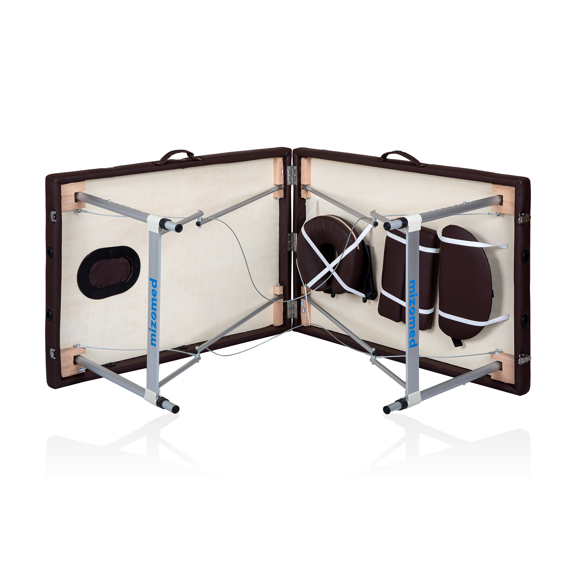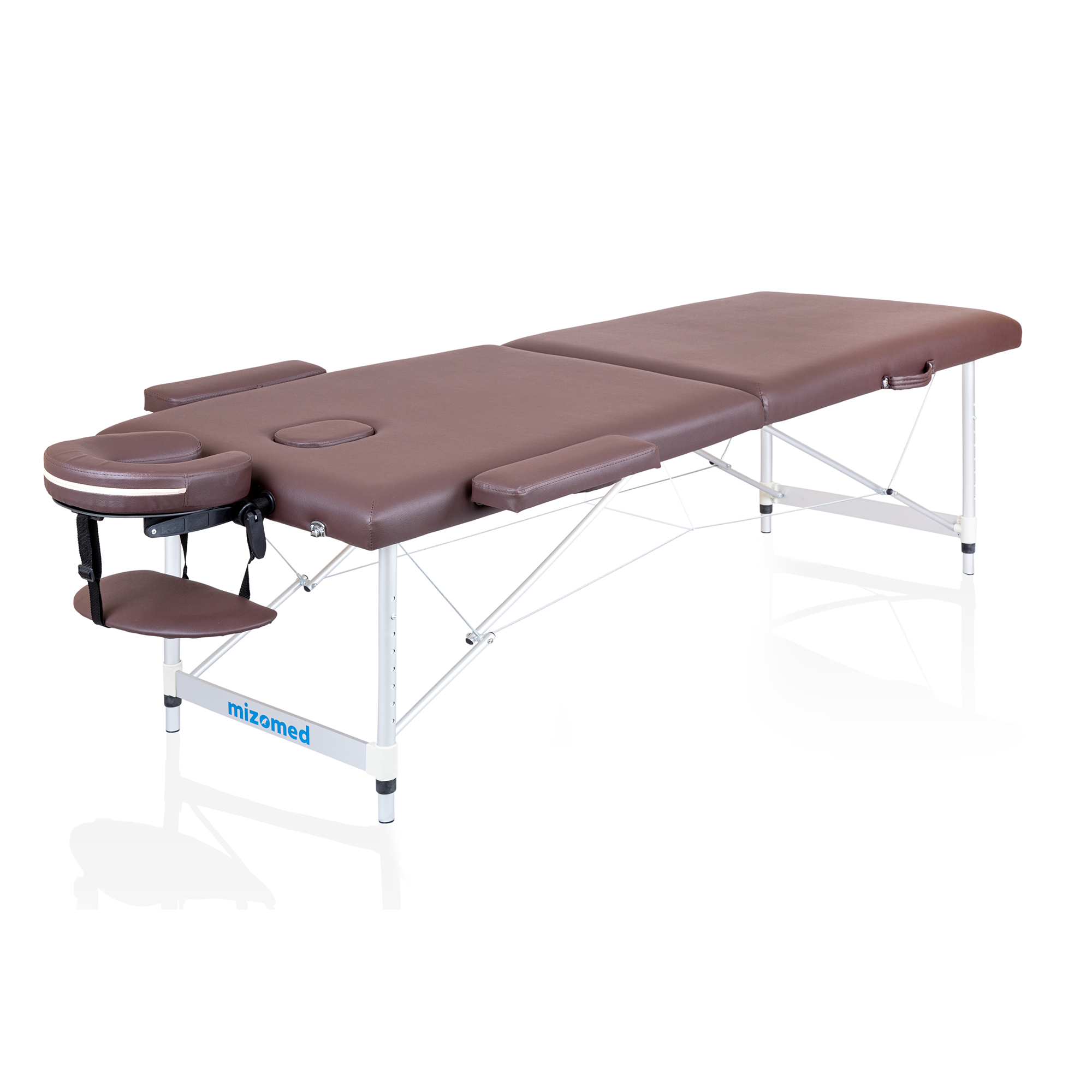 Складной массажный стол Mizomed Standart AL 2 Black имеет приятную на ощупь виниловую обивку с мягким наполнителем толщиной 4 см. Однако, главная особенность этого стола – его особо легкая поддерживающая конструкция и регулируемые по высоте ножки, сделанные из алюминия. Стол весит всего лишь 13 кг, что позволяет собрать или разобрать его меньше, чем за минуту! Такое оборудование идеально подойдет для тех мастеров, которым приходится часто менять свое место работы. Благодаря облегченной конструкции, кушетку достаточно просто перемещать в необходимое место и даже возить с собой.