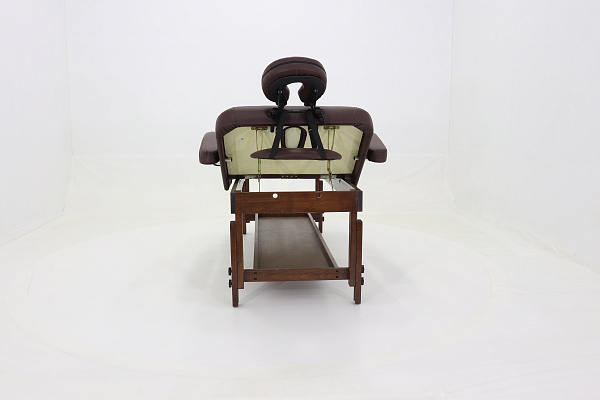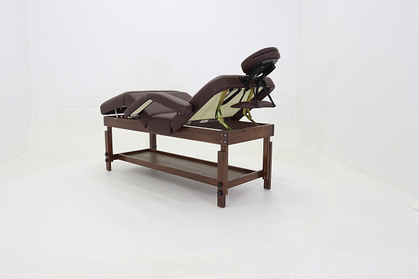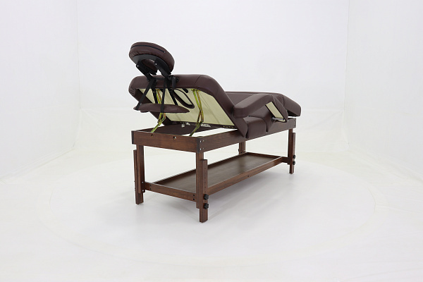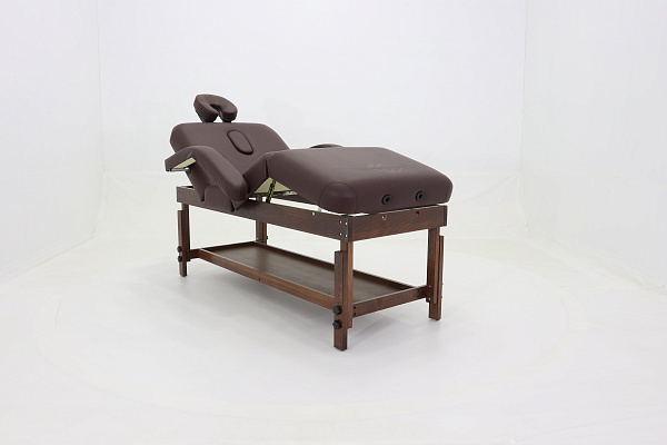 Высота ножек регулируется механическим способом, а все четыре секции ложа регулируют свой угол наклона. Наполнитель стола – пенополиуретан, упругий материал, который адаптируется к форме тела клиента. Обивка состоит из винил-люкса – поверхность легко моется и очищается от косметического масла.