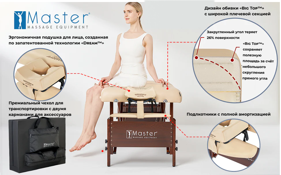 - Расширенная поверхность “BIG TOP”™ — на 26% больше мягкой зоны для работы и комфорта клиента.