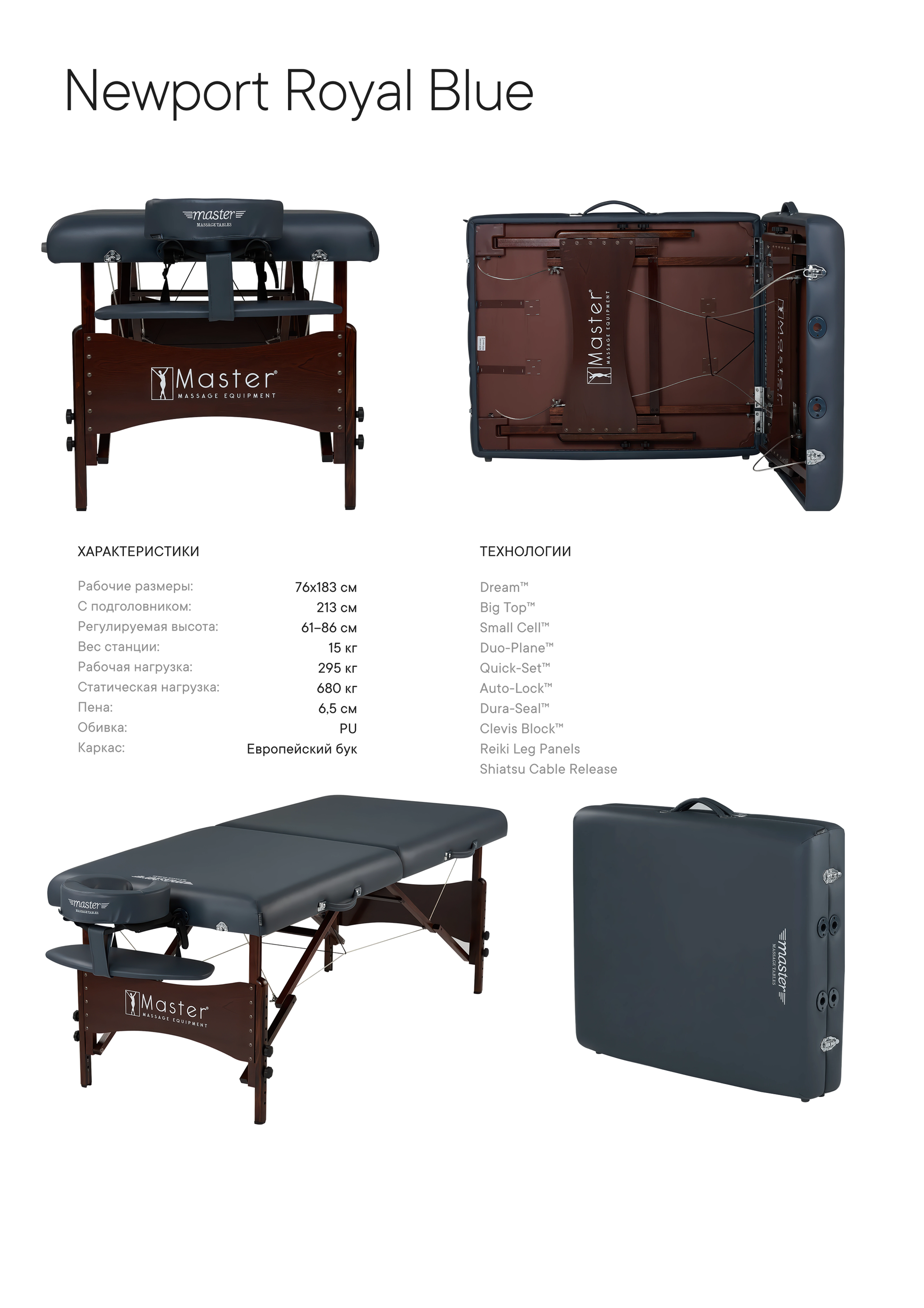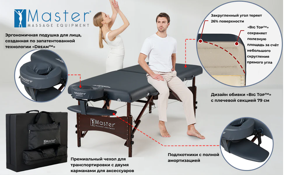 Благодаря конструкции "Big Top" и матрасу толщиной 6,5 см из уникального многослойного пеноматериала Multi-Layer Small Cell™ Foam, стол дарит максимальное удобство. Прямоугольные углы способствуют лучшему расслаблению плечевой зоны. Обивка цвета королевский синий устойчива к маслам и воде, не содержит вредных CFC, что гарантирует долговечность и безопасность этого профессионального оборудования.