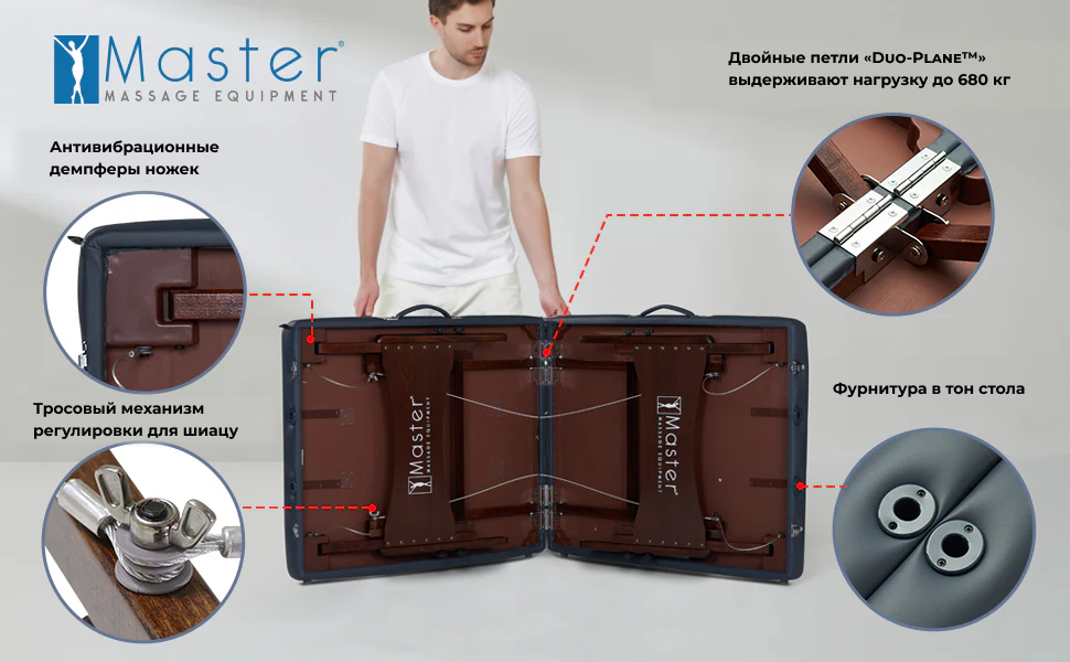 Массажный стол Master Massage Newport прост в установке и регулировке по высоте: ножки с автофиксацией (Auto-Lock), петли Duo-Plane, стабилизирующая перекладина и прочные крепления ножек Clevis Block обеспечивают повышенную надёжность.