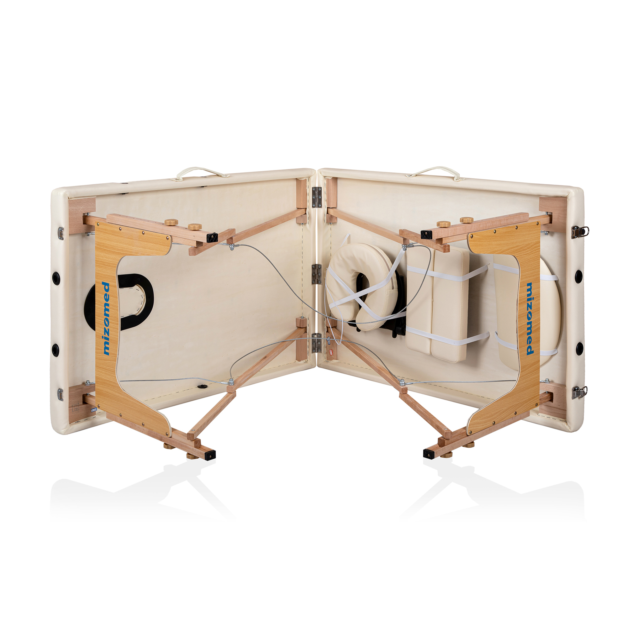 Складной массажный стол Mizomed Standart AL2 (S) имеет приятную на ощупь виниловую обивку с мягким наполнителем толщиной 4 см. Однако, главная особенность этого стола – его особо легкая поддерживающая конструкция и регулируемые по высоте ножки. Стол весит всего лишь 11 кг, что позволяет собрать или разобрать его меньше, чем за минуту! Такое оборудование идеально подойдет для тех мастеров, которым приходится часто менять свое место работы. Благодаря облегченной конструкции, кушетку достаточно просто перемещать в необходимое место и даже возить с собой.