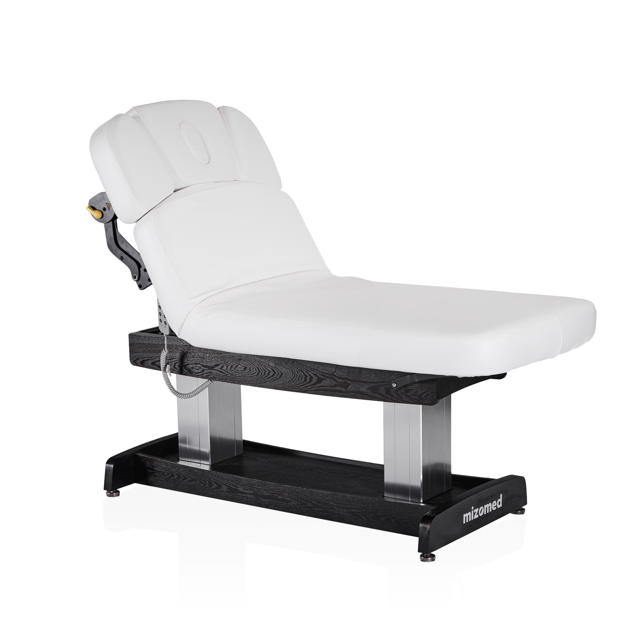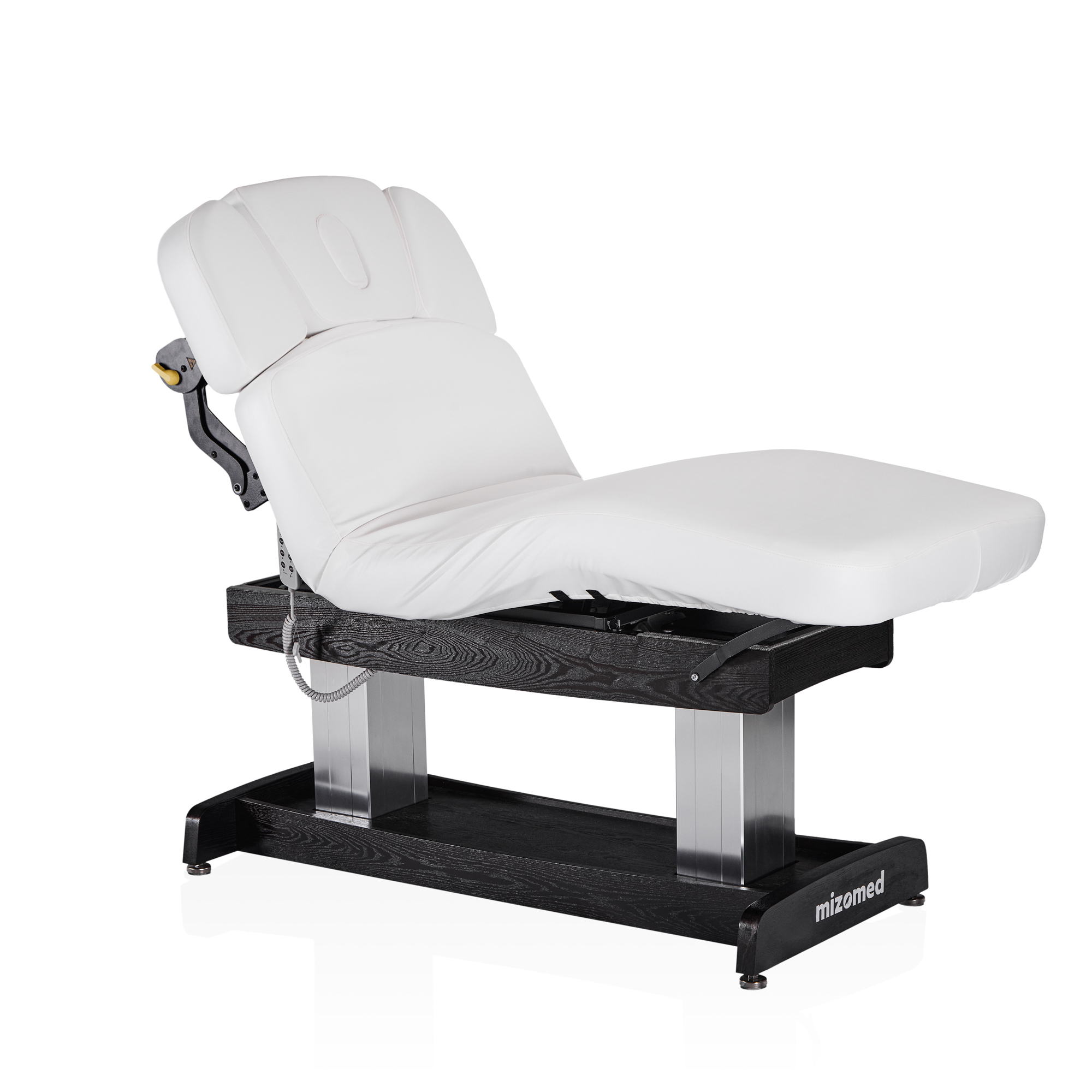 Конструкция стола включает в себя подъёмный механизм, обеспечивающий регулировку высоты для удобства как клиента, так и специалиста. Подголовник стола имеет возможность регулировки по высоте и углу наклона, что позволяет адаптировать его под индивидуальные потребности и предпочтения клиента, обеспечивая оптимальную поддержку и комфорт во время процедур.