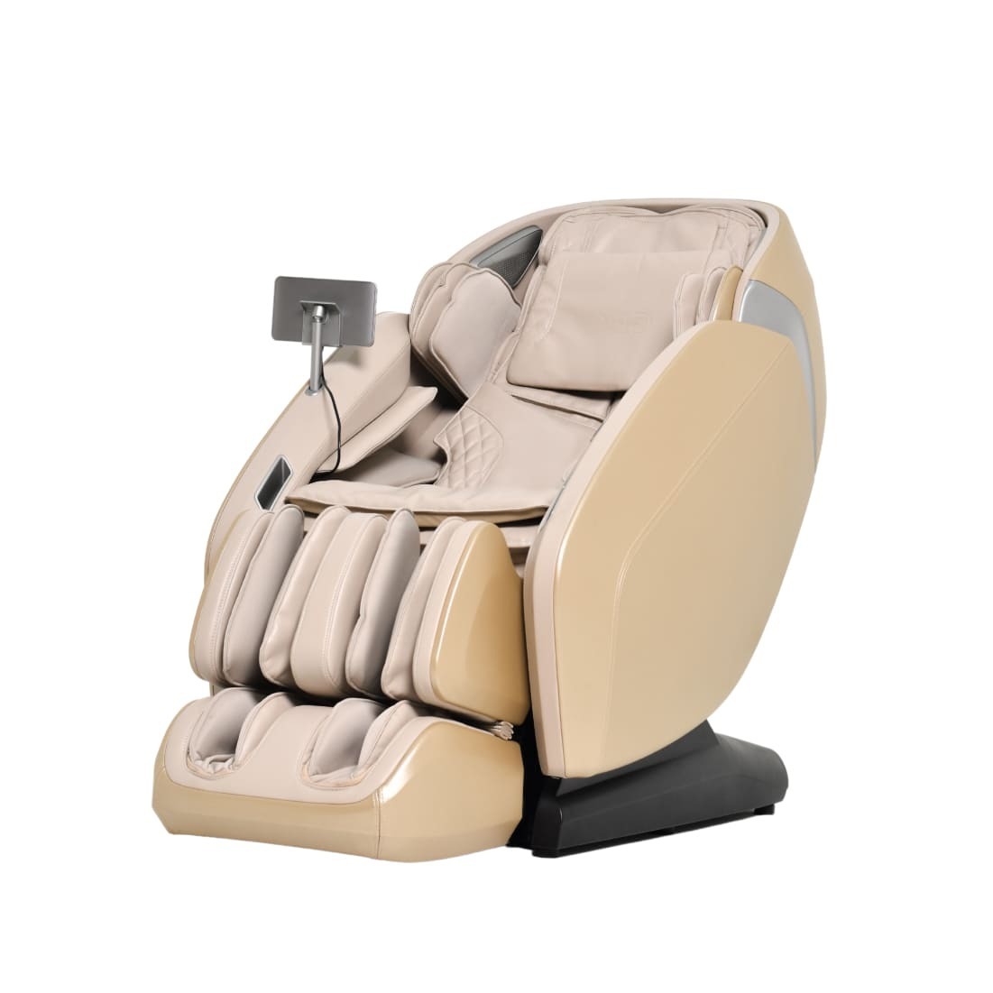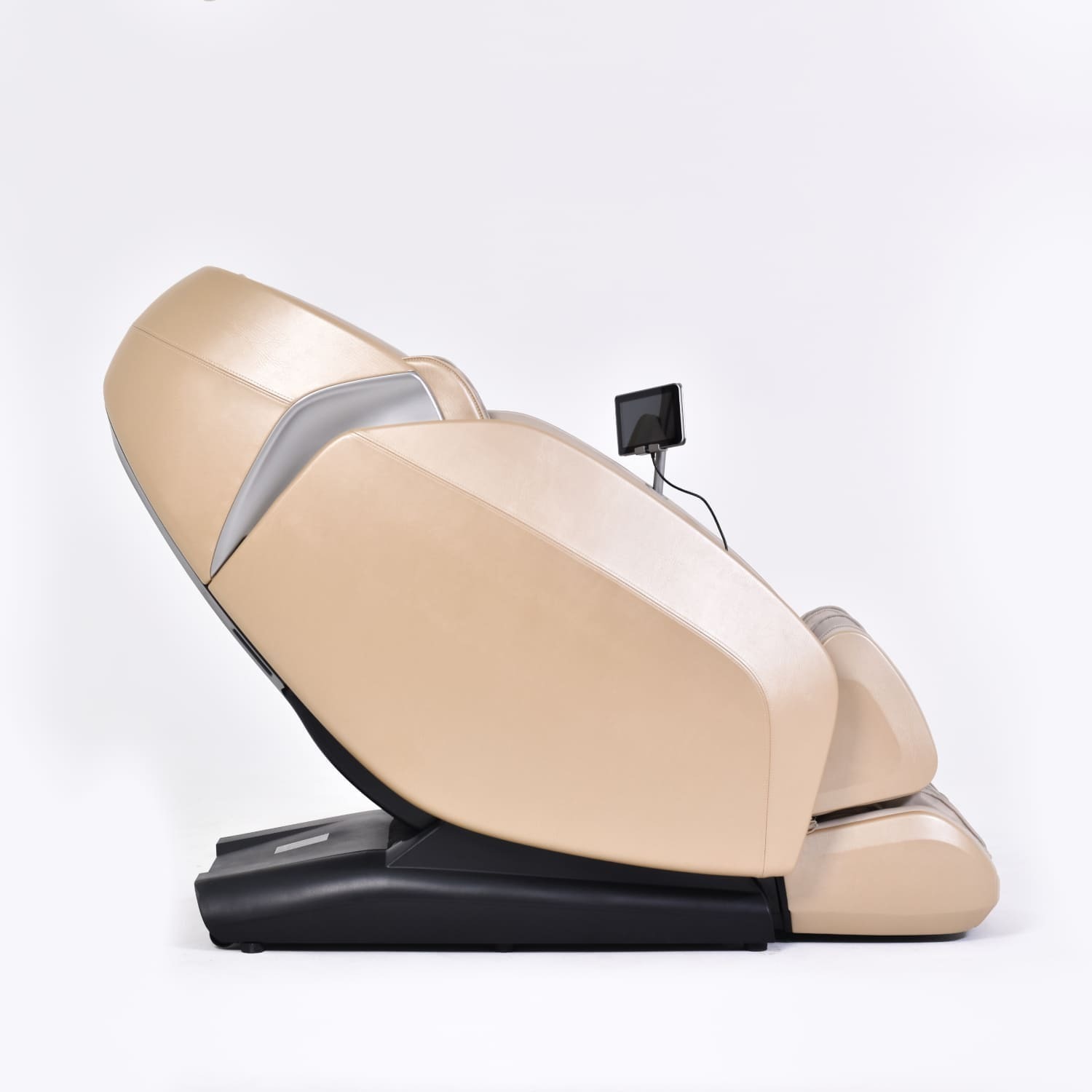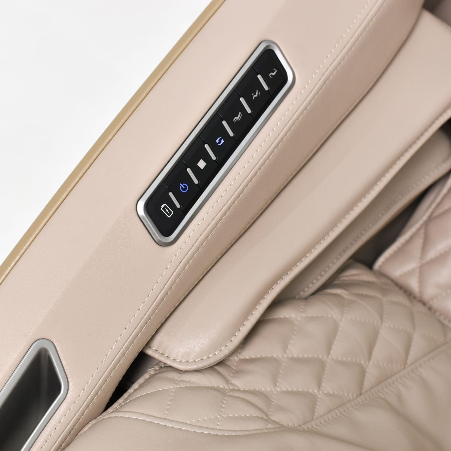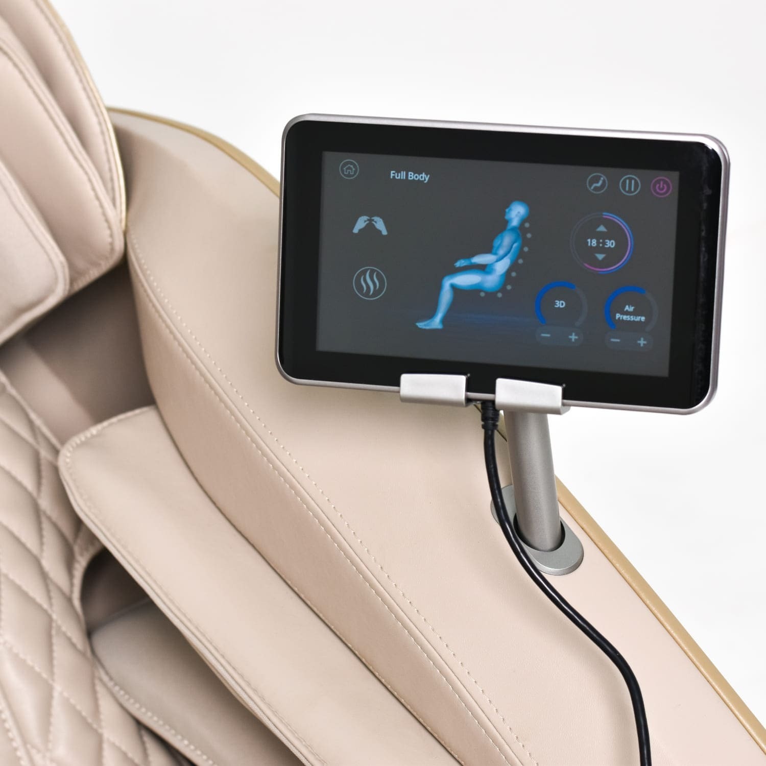 функцией точного сканирования тела; L-образной массажной кареткой; Zero-G. На пульте можно отрегулировать суперточный 3D массаж, настроить интенсивность надавливания массажных роликов на массируемую зону. В ручном массаже можно настроить массажные ролики по ширине, высоте, настроить скорость вращения. Воздушно-компрессионный массаж осуществляется 38 воздушными подушками. Интенсивность воздушно-компрессионного массажа имеет 5-ти ступенчатый диапазон. Можно выбрать область воздушно-компрессионного массажа: все тело, верхняя часть тела, талия и бедра, стопы и икры. Есть прогрев ног, скорость роликового массажа стоп можно отрегулировать под ваши предпочтения. Управлять массажными программами можно с помощью сенсорного планшетного пульта или кнопкой быстрого доступа на подлокотнике. Отличительной особенностью кресла является оснащение акустической системой и возможность подключения Bluetooth. Одна из автоматических программ – ритмичный массаж позволяет массажироваться в такт подобранной мелодии. Подставка для ног может удлиняться на 19 см, поэтому кресло подойдёт для любого роста. На подлокотнике предусмотрен встроенный usb-разъем, благодаря чему можно зарядить телефон. Таймер 10-20-30 минут.