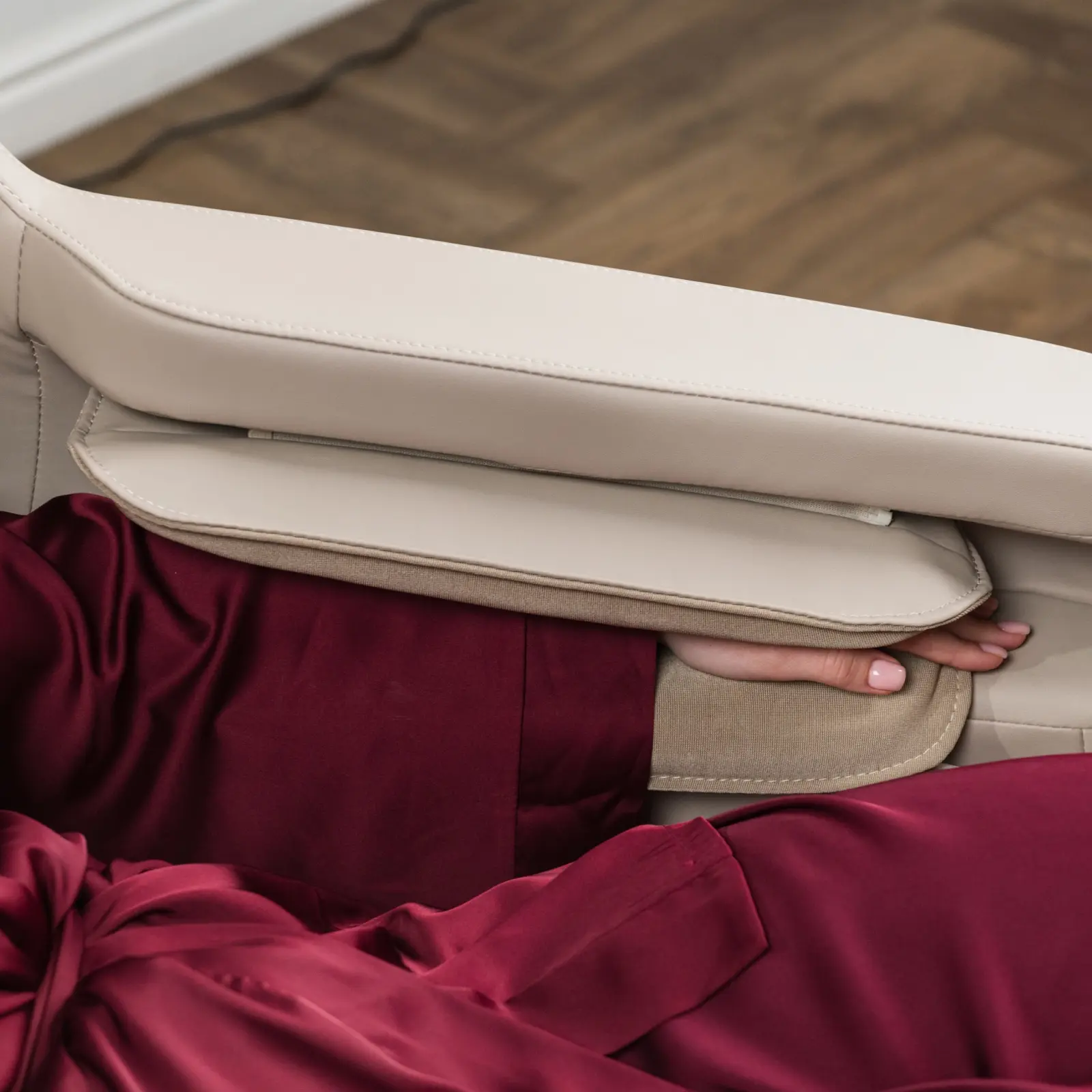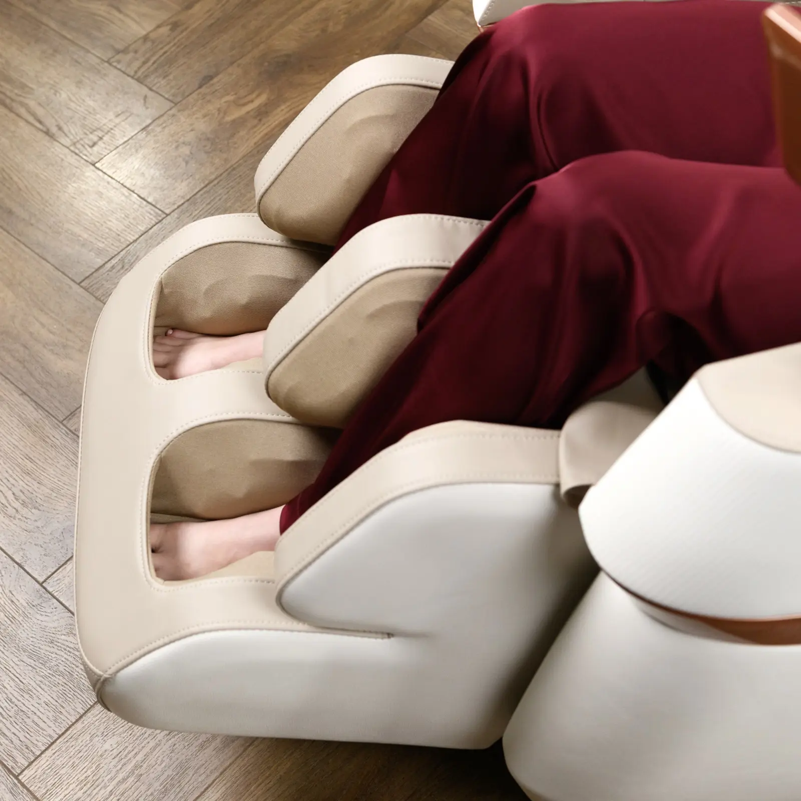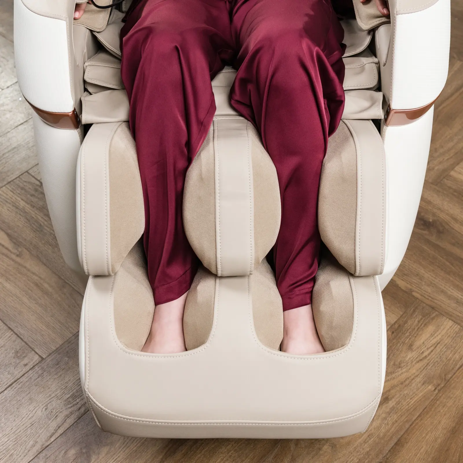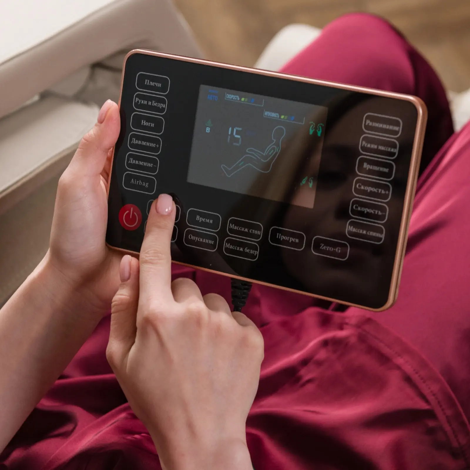 Кресло поддерживает 5 автоматических программ и ручной режим, где пользователь может настроить индивидуальные параметры: регулировать интенсивность массажа, включить прогрев поясницы и икр, а также активировать вибромассаж. Регулируемая секция для ног, выдвигается на 10 см и делает использование кресла комфортным для пользователей ростом до 195 см.