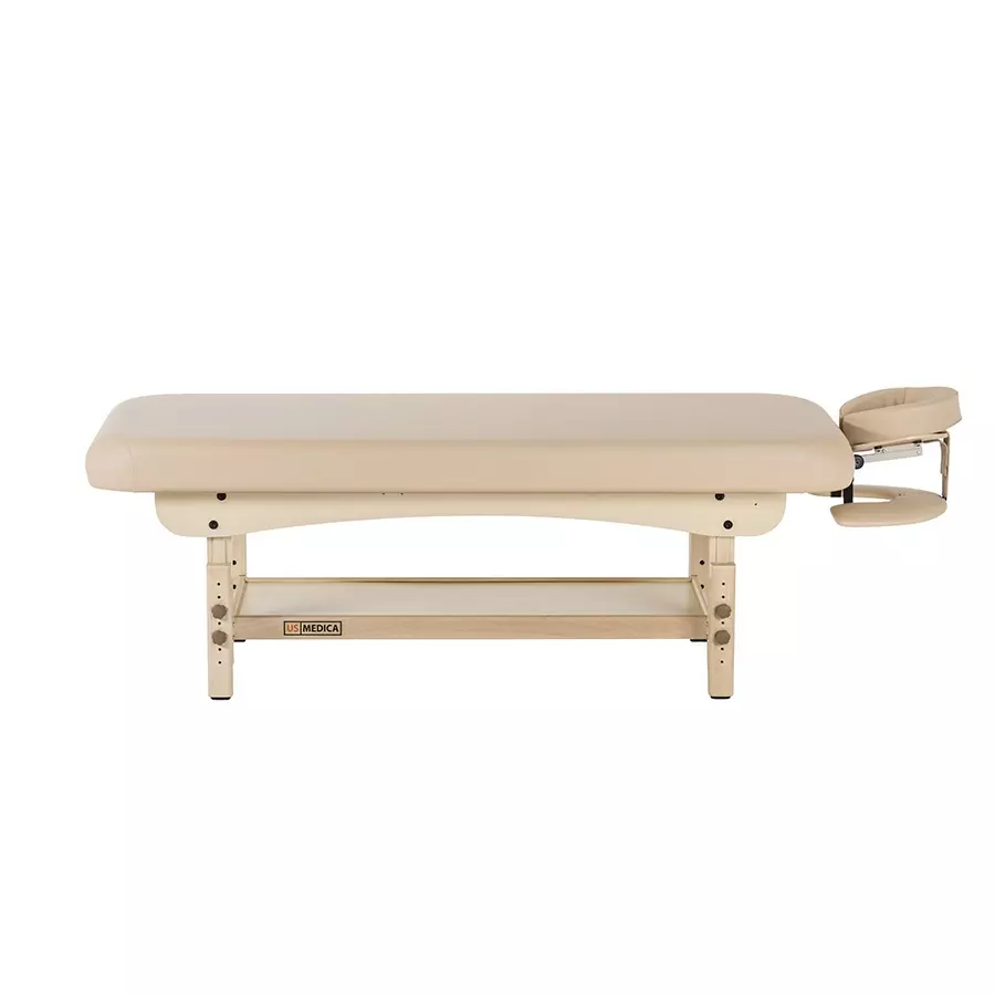 Стационарный массажный стол «Атлант» – модель для тех, кто ценит предельный уровень комфорта в сочетании со строгими линиями и классическим дизайном. Светлая расцветка арпатека всегда останется в тренде, а посетитель массажного кабинета сразу обратит внимание на стол US MEDICA Atlant.