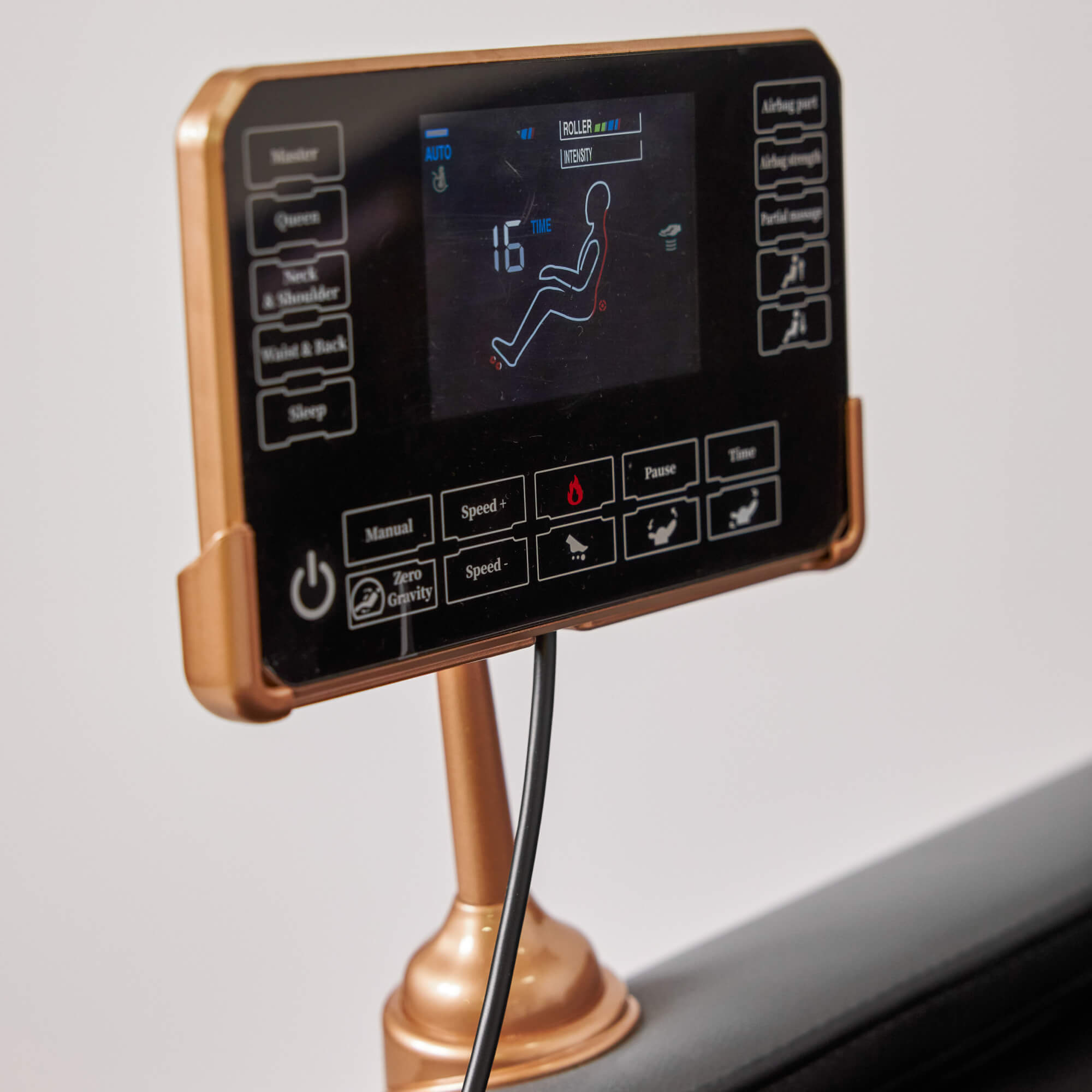 - Управляйте с легкостью! Интуитивно понятный LED дисплей позволяет легко управлять всеми функциями кресла. Вы сможете быстро выбрать нужную программу, регулировать интенсивность массажа и следить за временем сеанса. Яркие и четкие индикаторы делают использование кресла простым и удобным для любого пользователя. С помощью встроенного LED дисплея вы сможете также настроить положение спинки, отрегулировать подъем голеней, а также отрегулировать угол наклона кресла в режиме Zero Gravity, который помогает дополнительно снять усталость с мышц и улучшить кровообращение за счет имитации состояния невесомости. Функция памяти для двух пользователей положения массажера для плеч, интенсивности массажа, положение массажера для икроножных мышц и прочие данные о режиме массажа. При необходимости в меню можно настроить подогрев, роликовые массажеры, яркость экрана, время, язык и отображение состояния. Широкий диапазон изменения уровня давления и времени поможет настроить массажный механизм под свои потребности