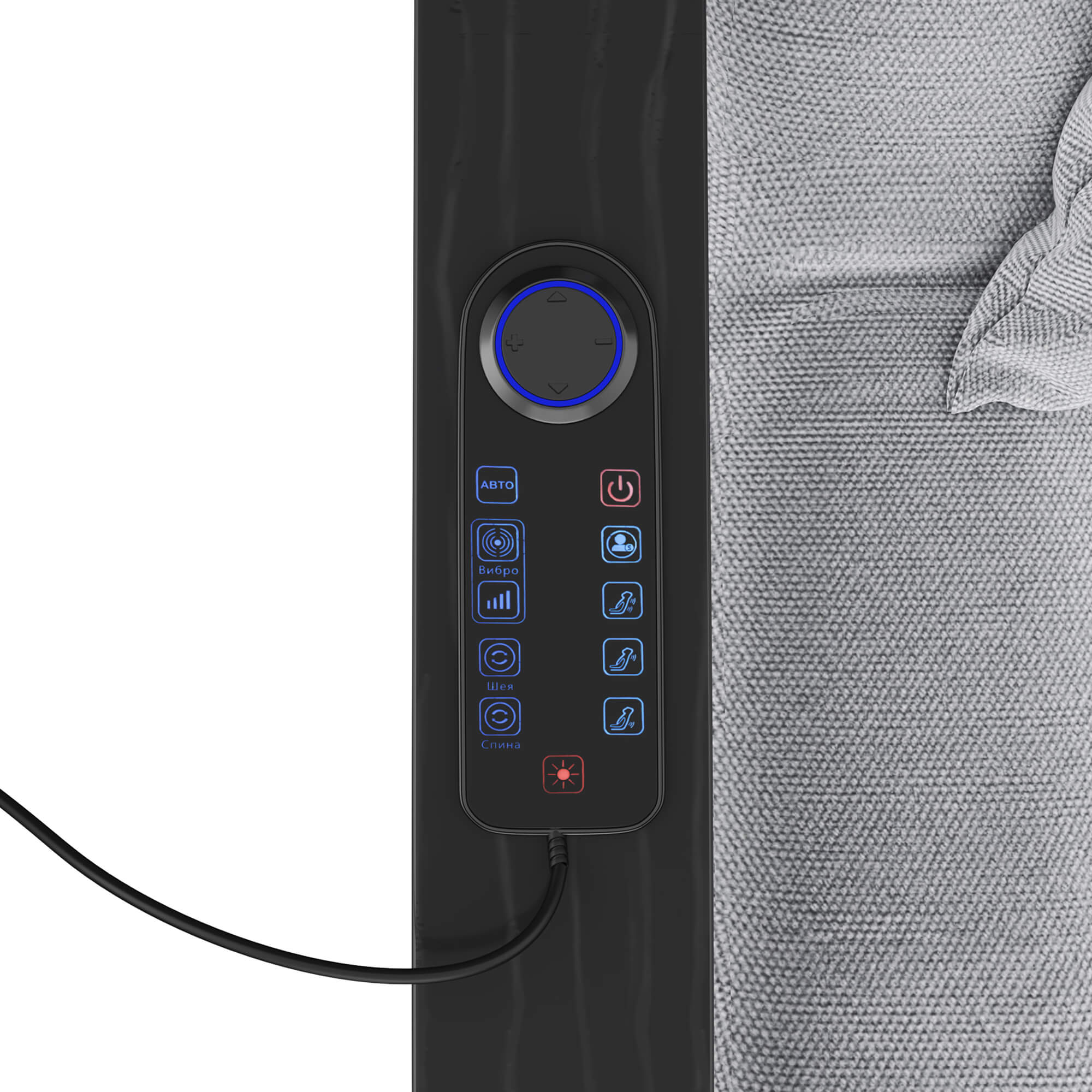 Массажер для шеи и спины оснащен удобным проводным пультом управления с интуитивно понятным интерфейсом, который вы можете положить в кармашек сбоку кресла. Вы сможете легко настроить режим массажа, выбрать нужную интенсивность и силу воздействия. Все это позволит сосредоточиться на своих ощущениях и наслаждаться процессом без лишних усилий. Подставка для ног имеет 5 положений для регулировки, чтобы вы выбрали для себя самое комфортное положение.