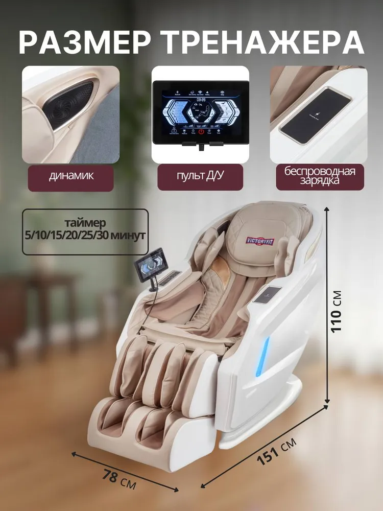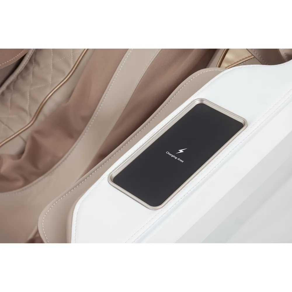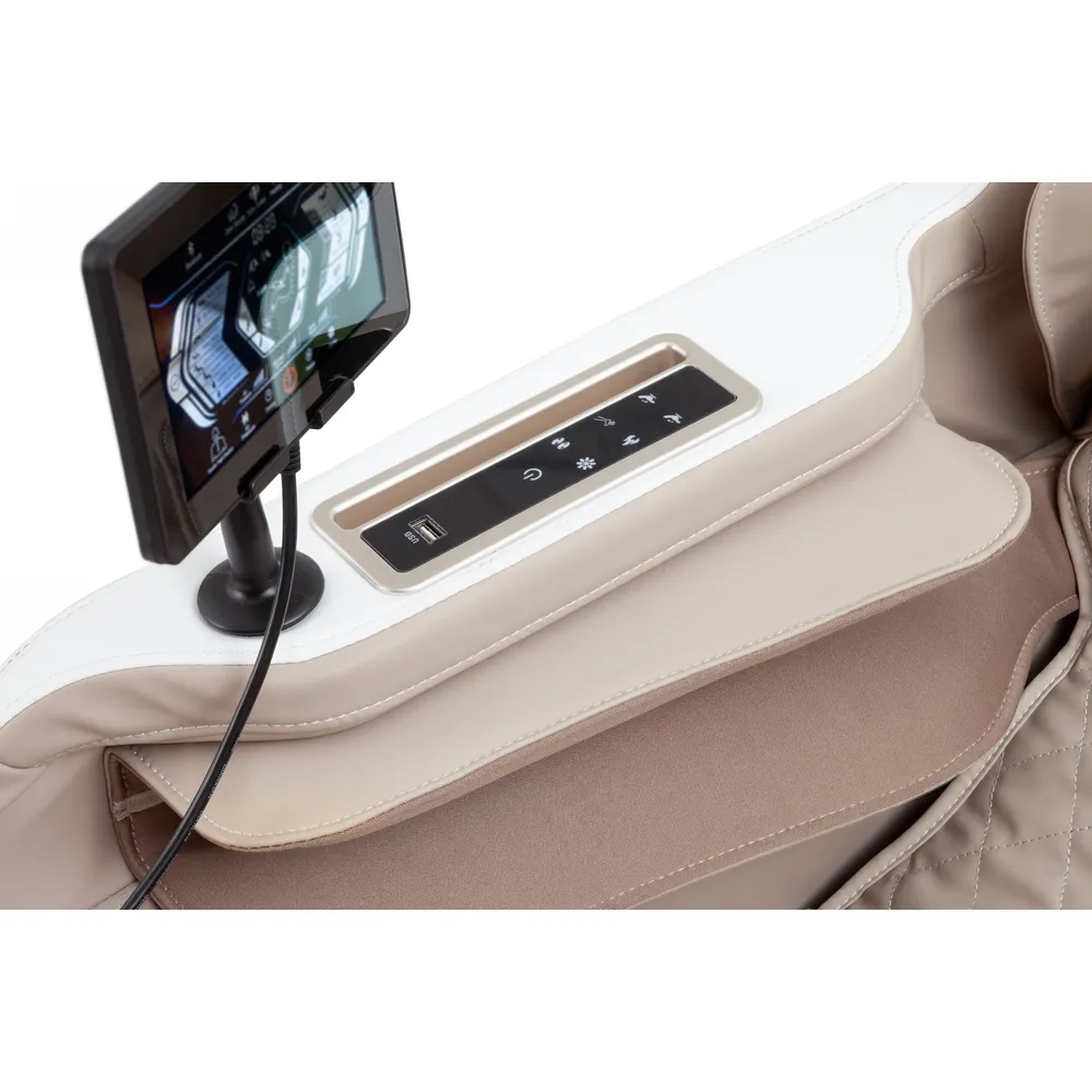 Нулевая гравитация (Zero Gravity), или наиболее удобная и комфортная поза, в которой тело располагается под углом 35-40 градусов, что обеспечивает более равномерную и более оптимальную нагрузку на массажные механизмы. Поза «Zero gravity» позволяет приподнять ноги, благодаря чему происходит отток крови, а массаж становится настоящим наслаждением. L-образная каретка сделает массаж максимально детализированным, начиная от ягодиц, заканчивая шейным отделом позвоночника. В кресле предусмотрено 8 автоматических программ для самых взыскательных пользователей. Присутствует массаж сжатым воздухом для ног, рук и плеч, а также функция нагрева спинки и сиденья кресла. Пульт управления планшетного типа, интуитивно понятный интерфейс. В правом подлокотнике встроен дополнительный пульт для выбора наиболее востребованных функций. В левом подлокотнике расположена беспроводная зарядная платформа для смартфонов* (*смартфон должен поддерживать функцию беспроводной зарядки)