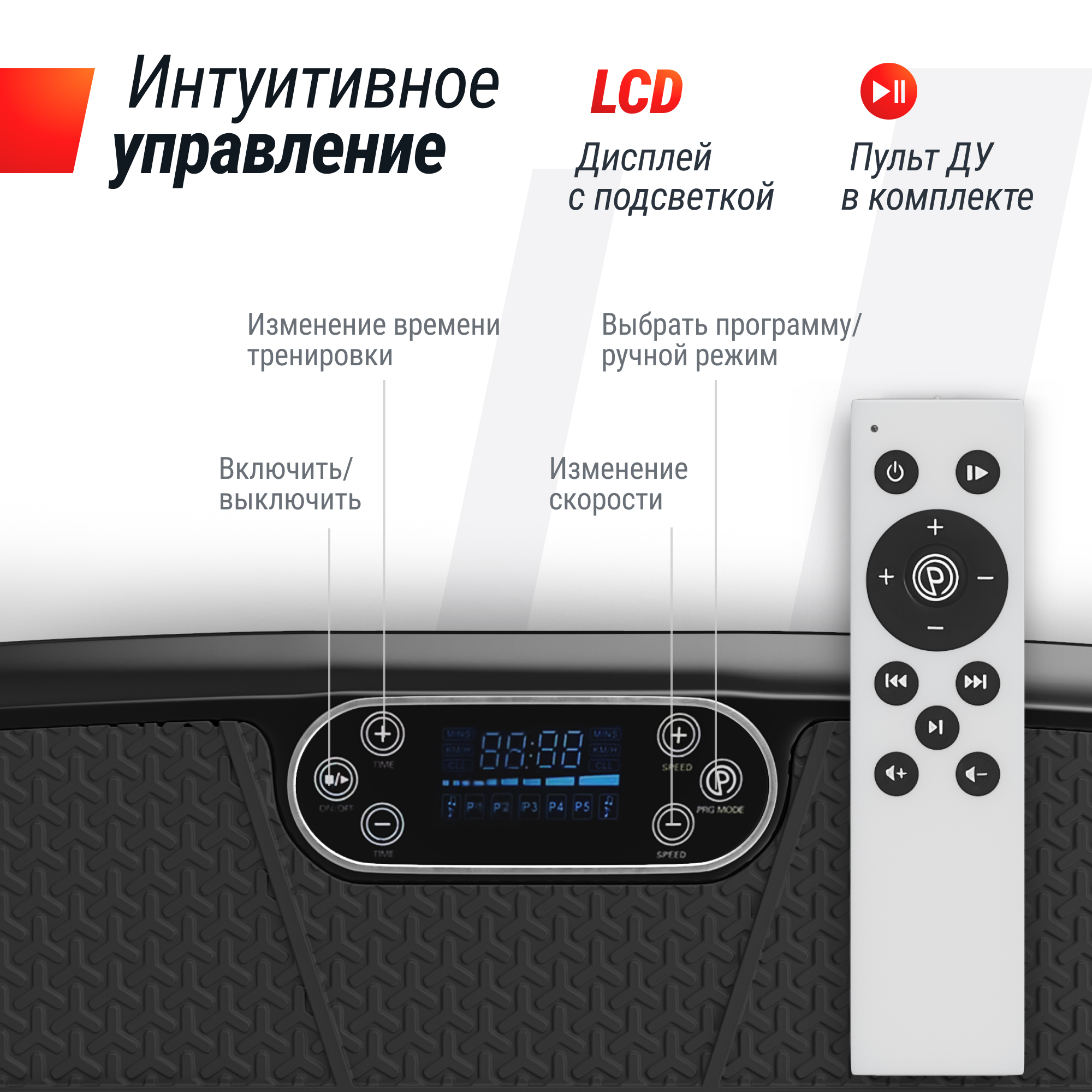 3. Многофункциональность: Платформа предлагает различные режимы вибрации и интенсивности, а также 5 автоматических программ, что позволяет адаптировать тренировки под ваши цели — от похудения до укрепления мышц. Таймер на 10 минут поможет контролировать ваши тренировки.